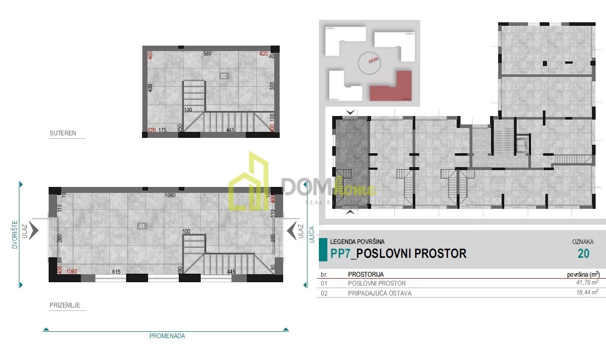 U sivoj je fazi, u dva nivoa, gornji dio je površine 41.78m2, a donji dio 18.44m2.