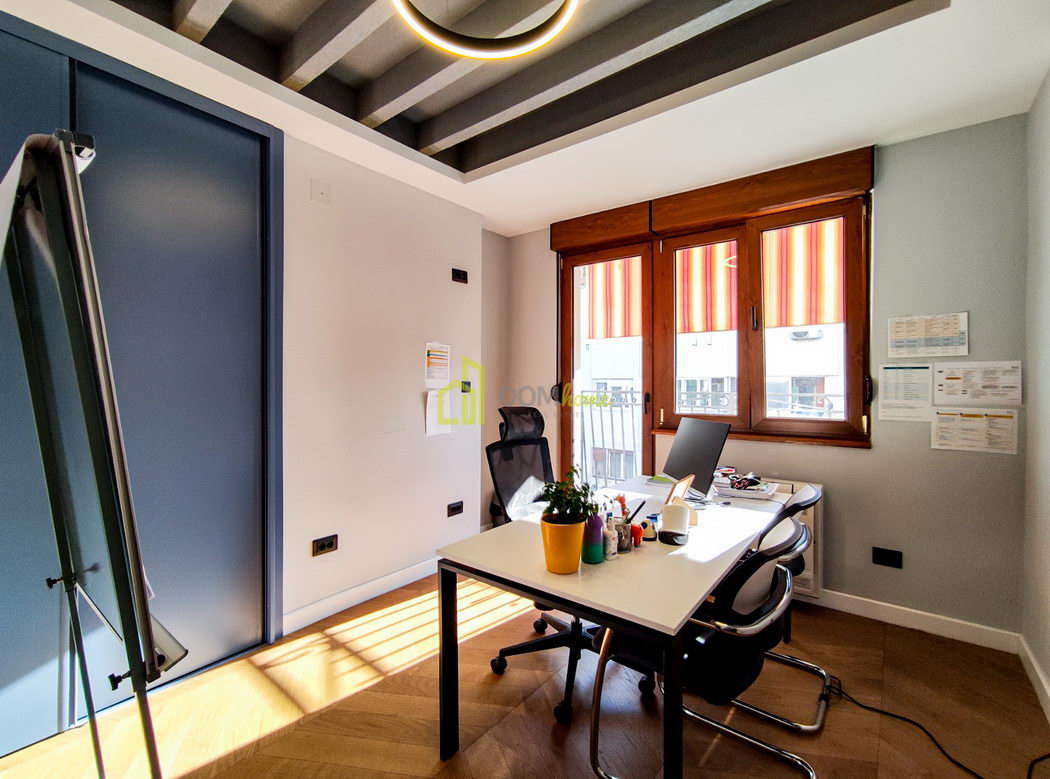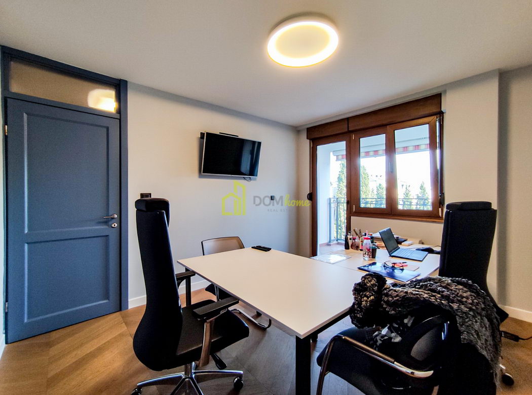 Posjeduje tri zasebne manje kancelarije, jednu salu za sastanke, čajnu kuhinju, tri terase i dva kupatila.