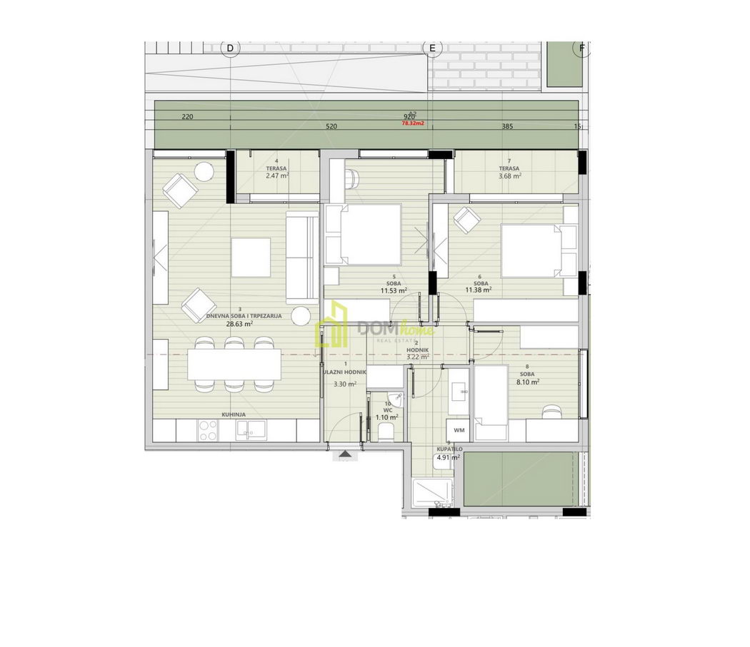 ✅ Struktura stana: Ulazni hodnik, dnevni boravak, kuhinja, trpezarija, tri spavaće sobe, kupatilo, toalet i dvije terase.
