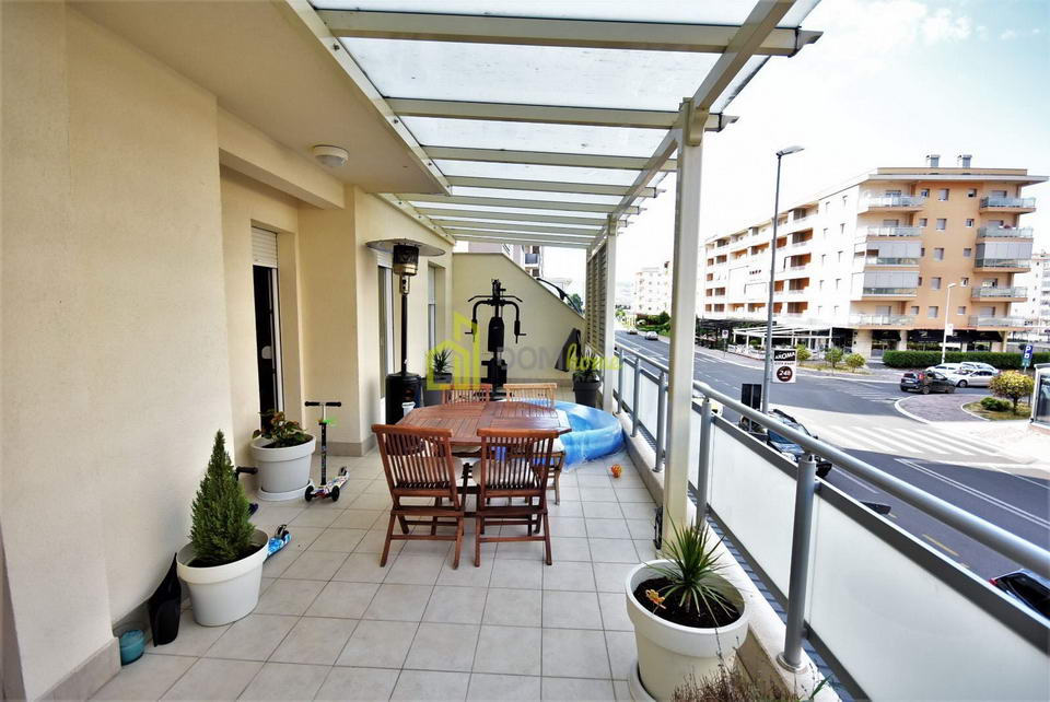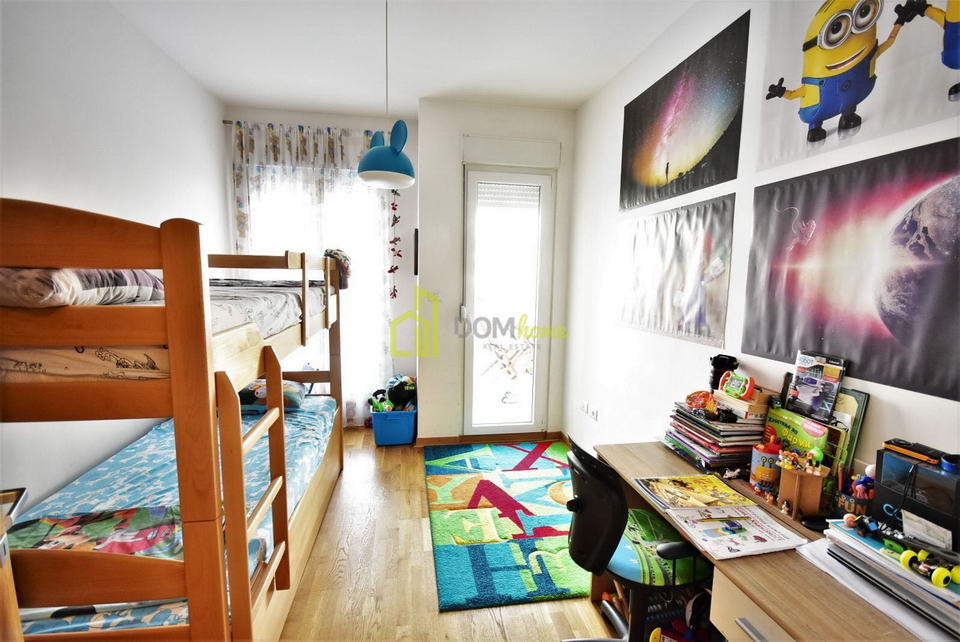 Luksuzno je namješten, komforan i prozračan, ima ugrađen multisplit sistem (grijanje/hlađenje), posjeduje terasu površine 30m2, koje je zatvorena aluminijskom konstrukcijom i pamplex staklom i nije uračunata u ukupnu kvadraturu stana, kao i garažno mjesto površine 14m2. Cijena mjesečnog zakupa stana sa jednim garažnim mjestom bila bi 600€.
