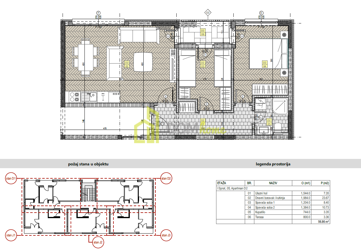 Struktura: ulazni hodnik, dnevni boravak, trpezarija i kuhinja, dvije spavaće sobe, kupatilo i terasa.