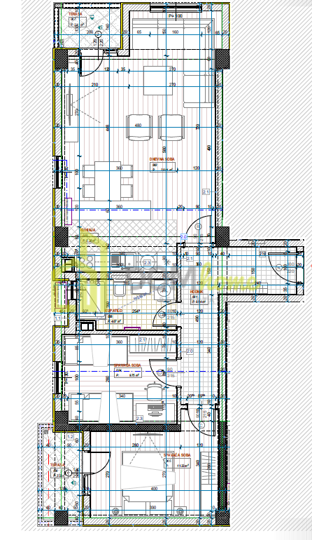 Struktura: ulazni hodnik, dnevni boravak, trpezarija i kuhinja, dvije spavaće sobe, kupatilo i dvije terase.