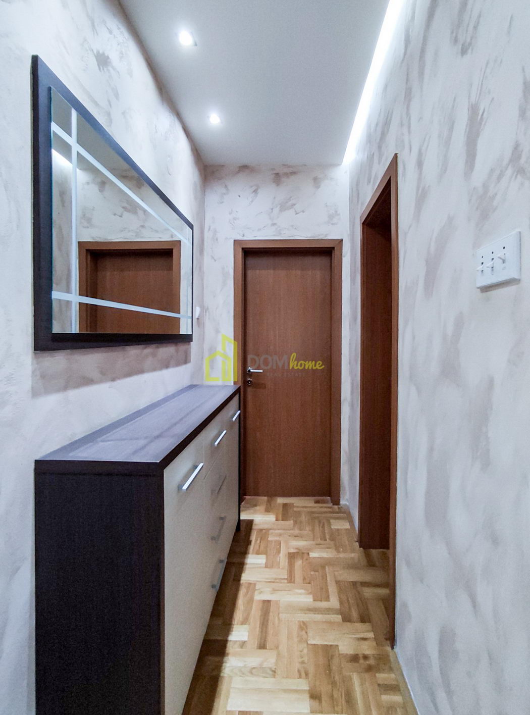 Struktura stana: Ulazni hodnik, dnevni boravak, kuhinja, trpezarija, dvije spavaće sobe, kupatilo, toalet i dvije terase.