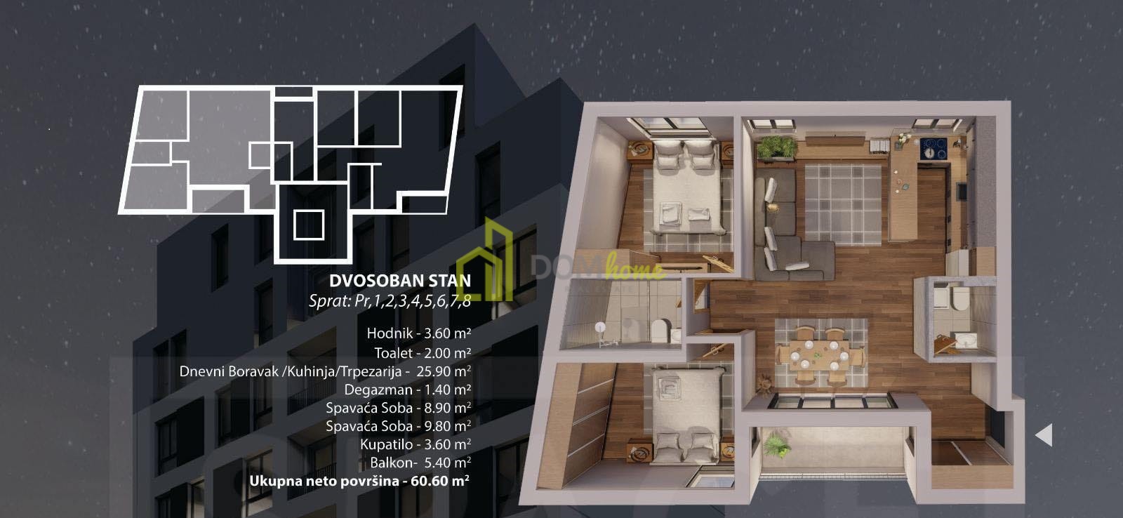 Struktura stana: Ulazni hodnik, dnevni boravak, kuhinja, trpezarija, dvije spavaće soba, kupatilo, toalet, garderober i terasa.