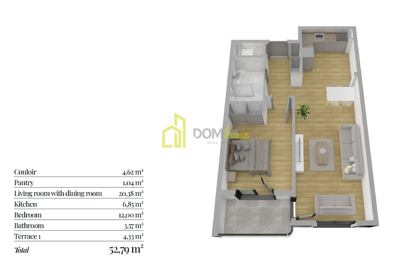 Struktura stana: Ulazni hodnik, ostava, dnevni boravak, kuhinja, trpezarija, spavaća soba, kupatilo i terasa.