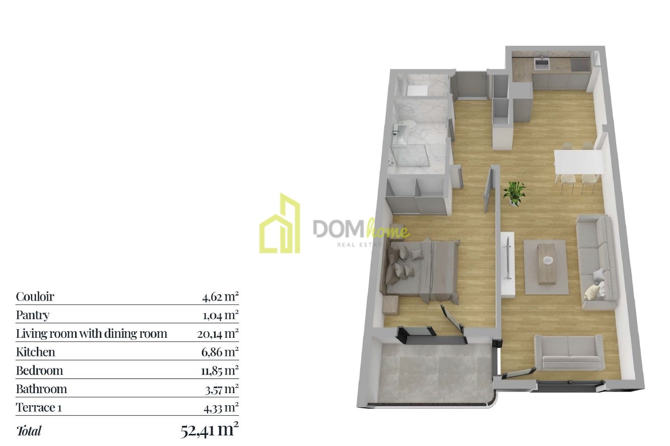 Struktura stana: Ulazni hodnik, ostava, dnevni boravak, kuhinja, trpezarija, spavaća soba, kupatilo i terasa.