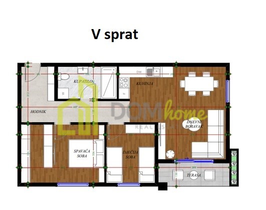 Struktura stanova: ulazni hodnik, dnevni boravak, kuhinja, trpezarija, dvije spavaće sobe, kupatilo i terasa.