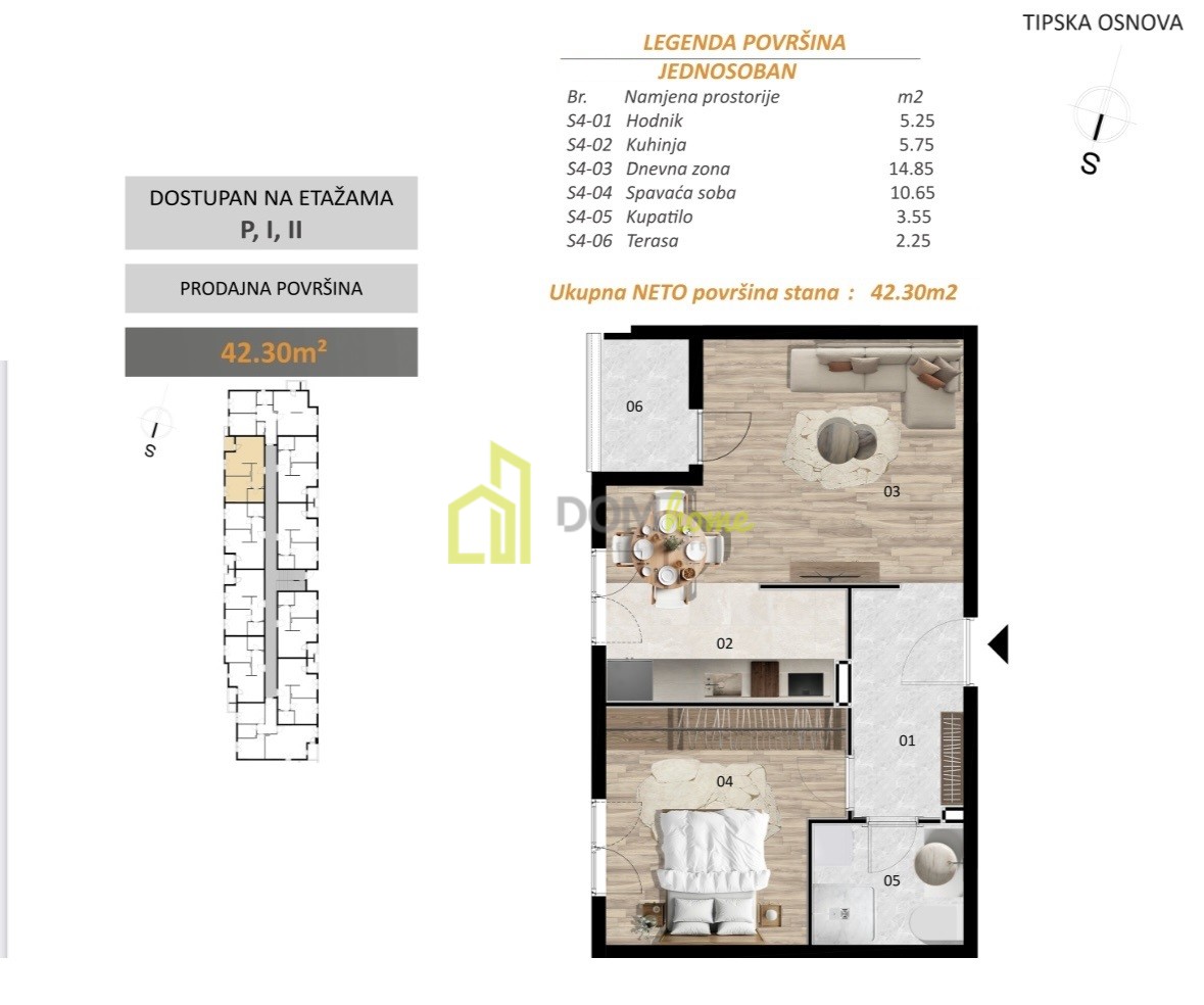 Struktura: Ulazni hodnik, dnevni boravak, kuhinja, trpezarija, spavaća soba, kupatilo i terasa.
