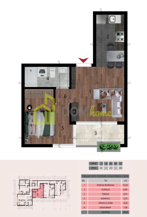 Tek yatak odalı daire 36.60m2, Šušanj