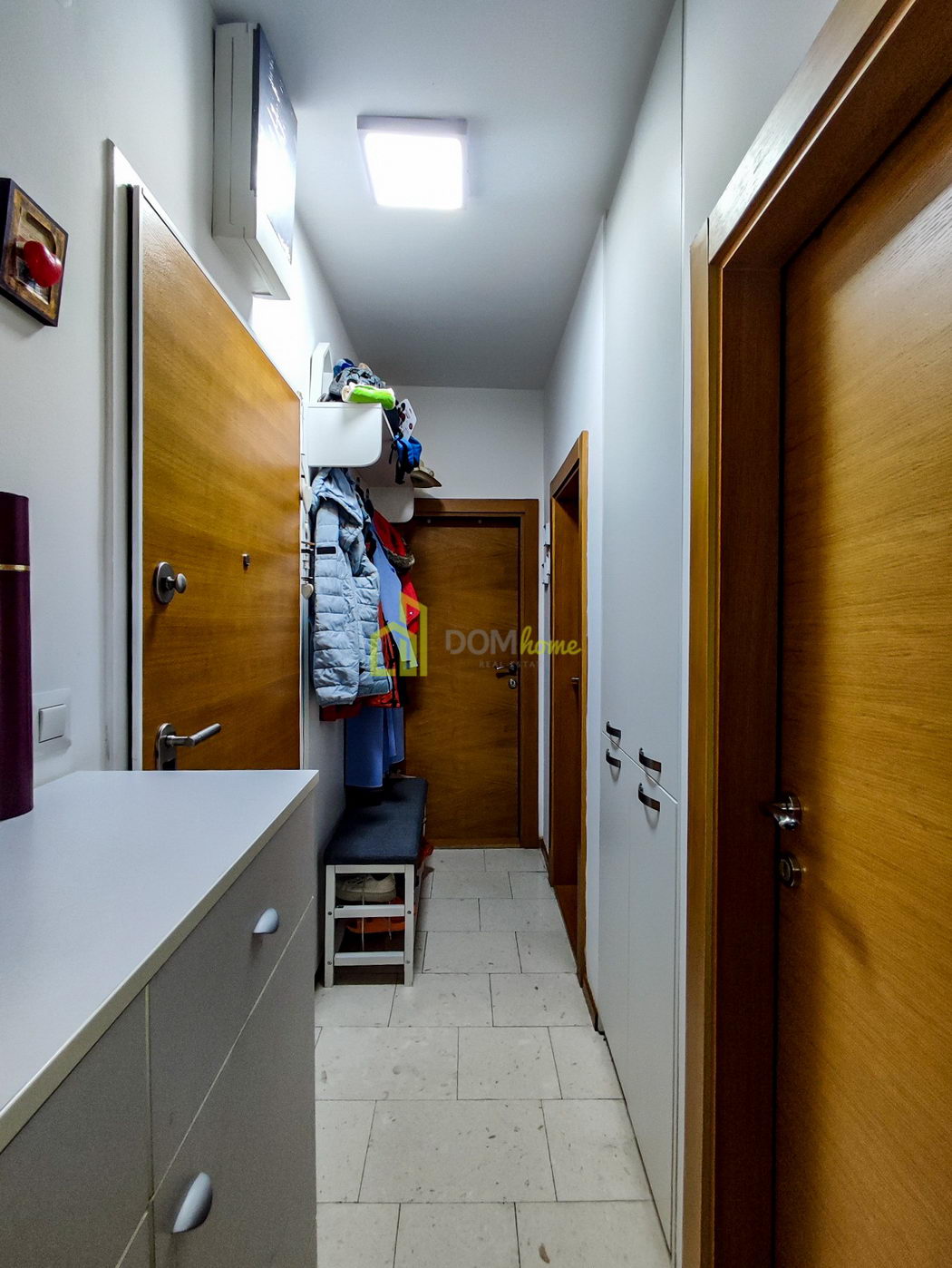 Apartman yapısı: giriş holü, oturma odası, mutfak, yemek odası, iki yatak odası, banyo ve geniş teras.